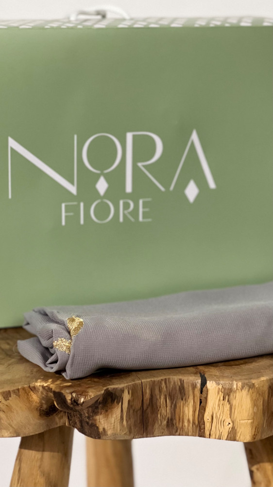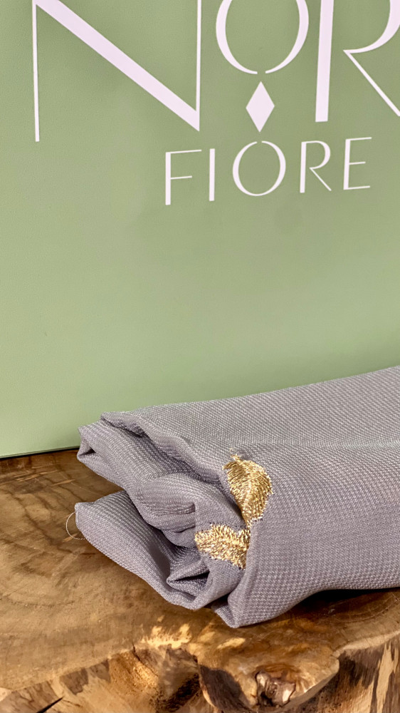طرحة رمادي مطرزة بالذهبي على شكل ريشة