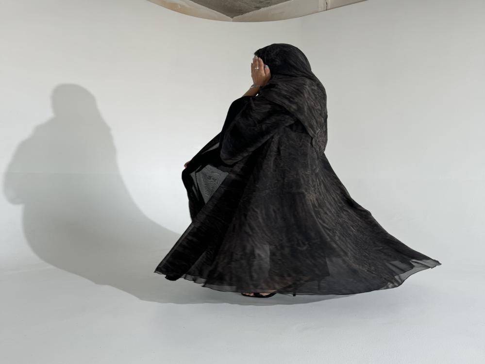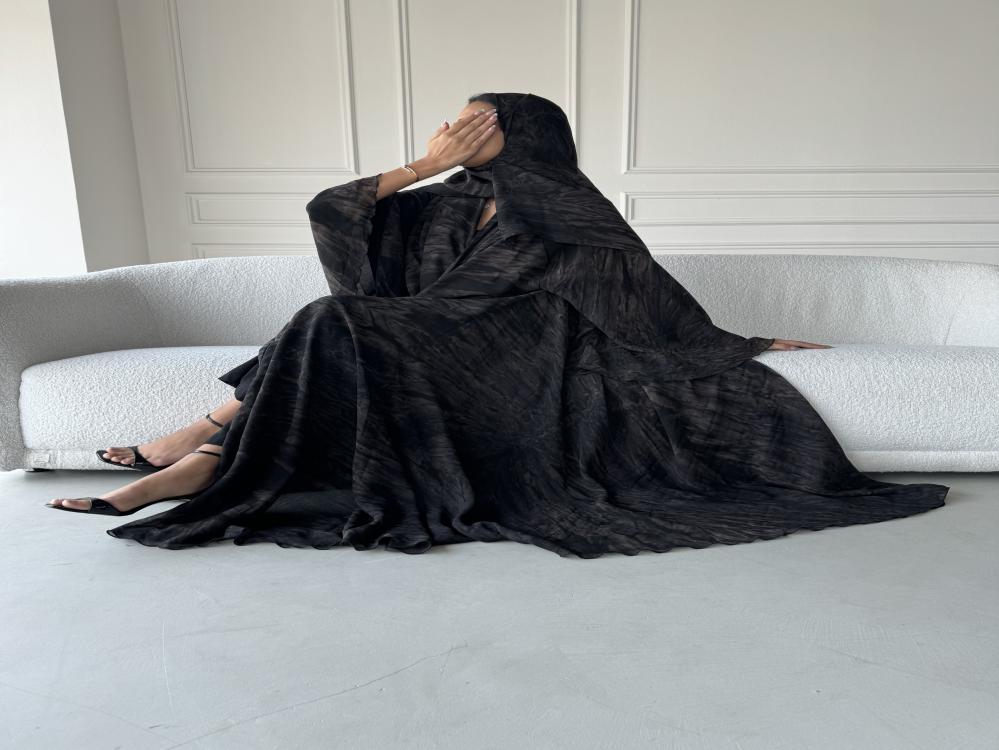 عباية شيفون مطبوع بتموج مميز ( رمادي على بني ) ✨ طبقتين شيفون