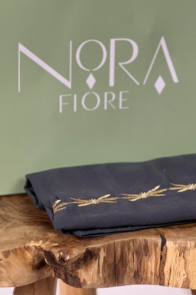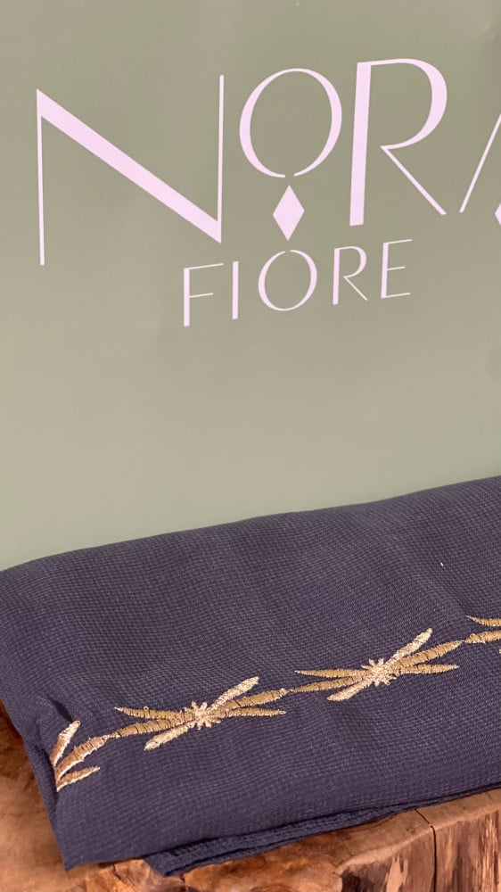 طرحة رمادي مطرزة بالذهبي بشكل طولي